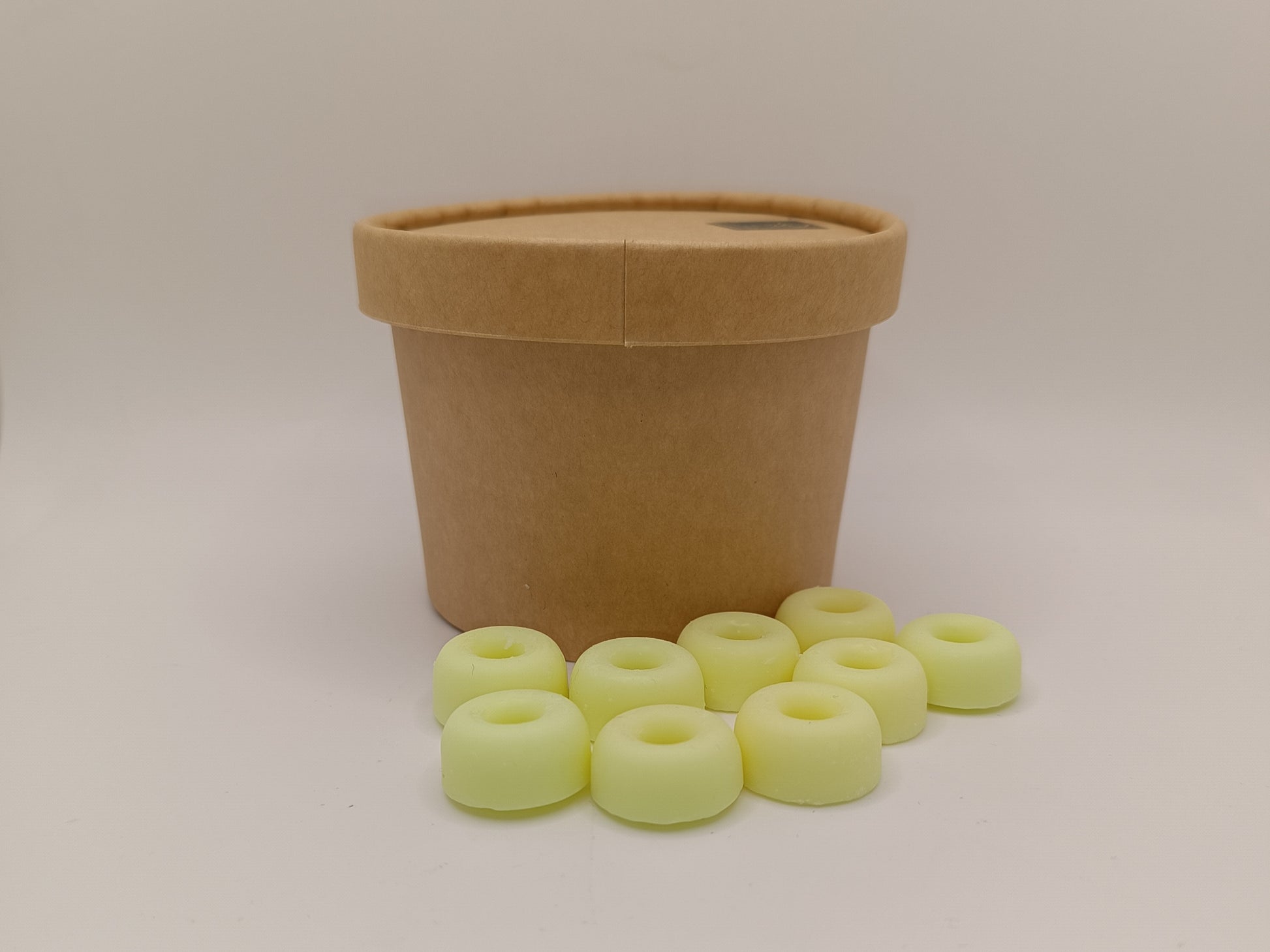 Αφεθείτε στη μαγεία των αρωμάτων με τα Χειροποίητα Wax Melts σε σχήμα mini donuts, φτιαγμένα από 100% φυτικό κερί ελαιοκράμβης και καρύδας. Αυτά τα αρωματικά melts συνδυάζουν τη φυσικότητα και την αισθητική, δημιουργώντας μια αρωματική εμπειρία που διαρκεί πολλές ώρες. Διατίθεται σε συσκευασίες των 50gr (70+ ώρες καύσης) και 100gr (150+ ώρες καύσης), για να γεμίσετε τον χώρο σας με το αγαπημένο σας άρωμα.